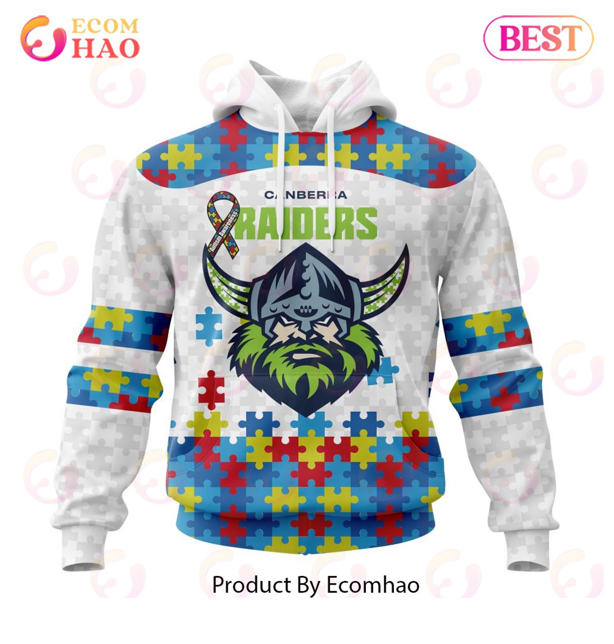 NRL Canberra Raiders Custom Name Number Autism Awareness Pullover Hoodie Product Features Along with its Canberra Raiders graphics, this cozy pullover hoodie features super-soft midweight material. Material: 95% polyester + 5% spandex. The fabric is durable and resistant to wrinkles, shrinking and mildew. Hood with drawstrings. Long sleeve. Front pouch pocket. Midweight hoodie suitable for...