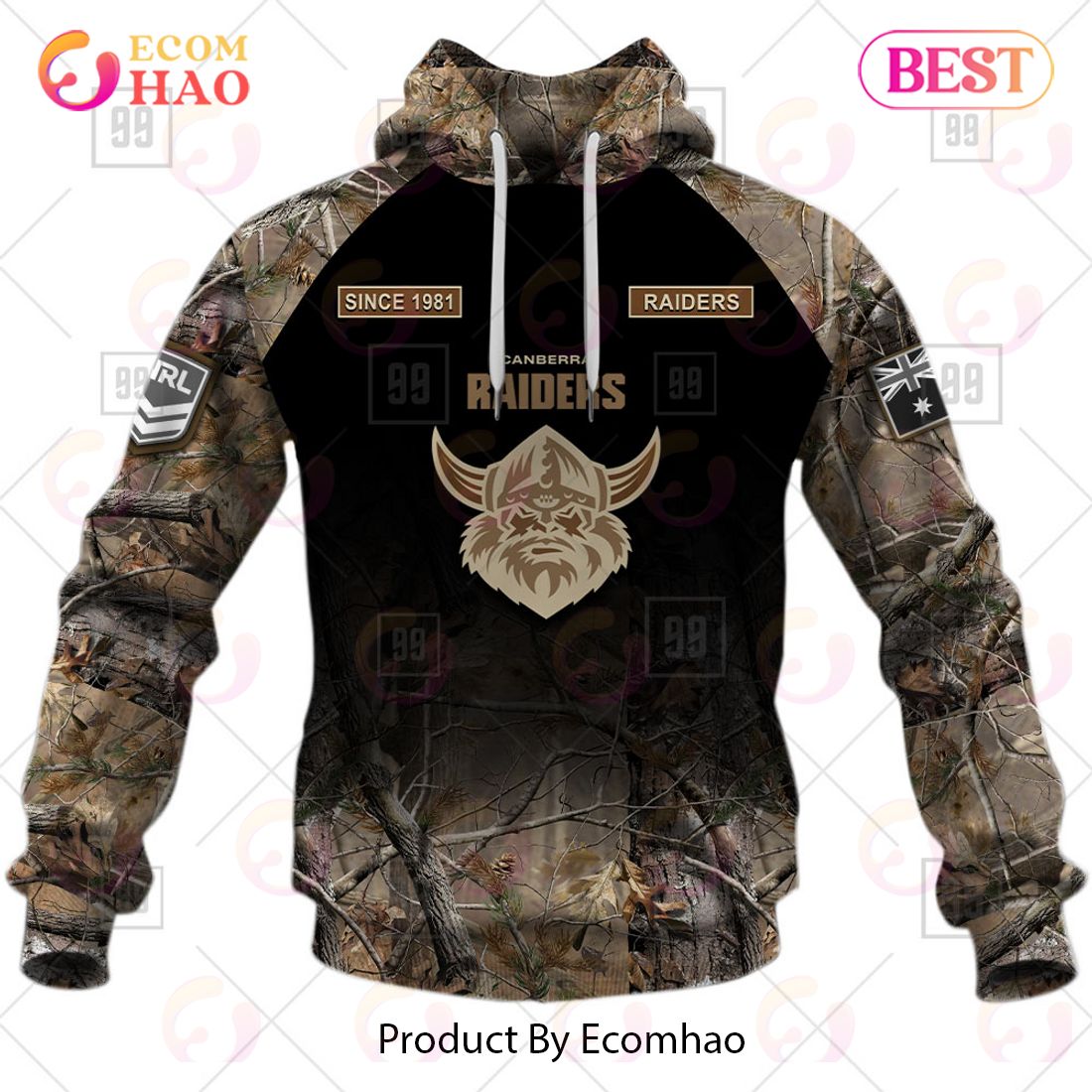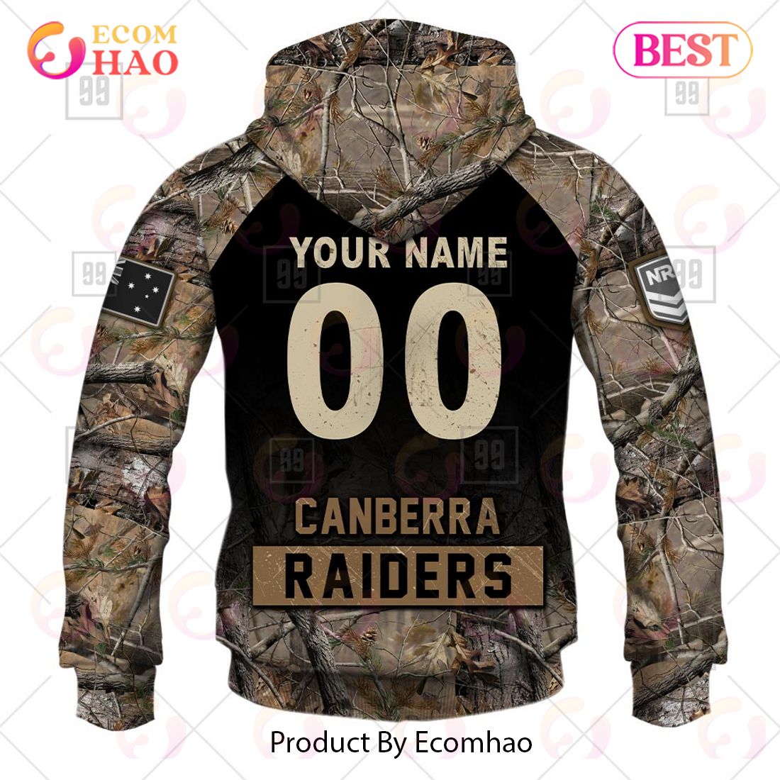 NRL Canberra Raiders Custom Name Number Camo Pullover Hoodie Product Features Along with its Canberra Raiders graphics, this cozy pullover hoodie features super-soft midweight material. Material: 95% polyester + 5% spandex. The fabric is durable and resistant to wrinkles, shrinking and mildew. Hood with drawstrings. Long sleeve. Front pouch pocket. Midweight hoodie suitable for moderate...
