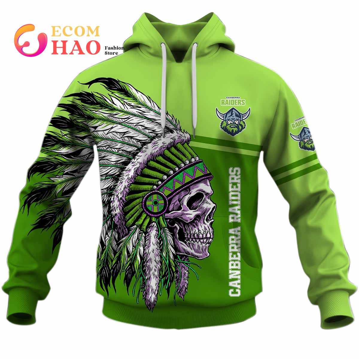 NRL Canberra Raiders Custom Name Number Native Skull Pullover Hoodie Product Features Along with its Canberra Raiders graphics, this cozy pullover hoodie features super-soft midweight material. Material: 95% polyester + 5% spandex. The fabric is durable and resistant to wrinkles, shrinking and mildew. Hood with drawstrings. Long sleeve. Front pouch pocket. Midweight hoodie suitable for...