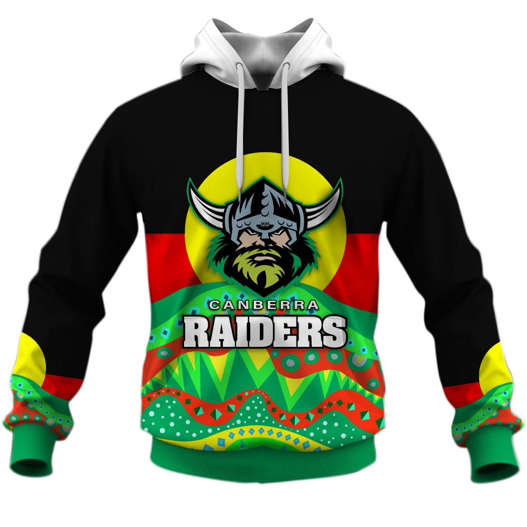 NRL Canberra Raiders Dinky Di Lover Aboriginal Flag x Indigenous Pullover Hoodie Product Features Along with its Canberra Raiders graphics, this cozy pullover hoodie features super-soft midweight material. Material: 95% polyester + 5% spandex. The fabric is durable and resistant to wrinkles, shrinking and mildew. Hood with drawstrings. Long sleeve. Front pouch pocket. Midweight hoodie...
