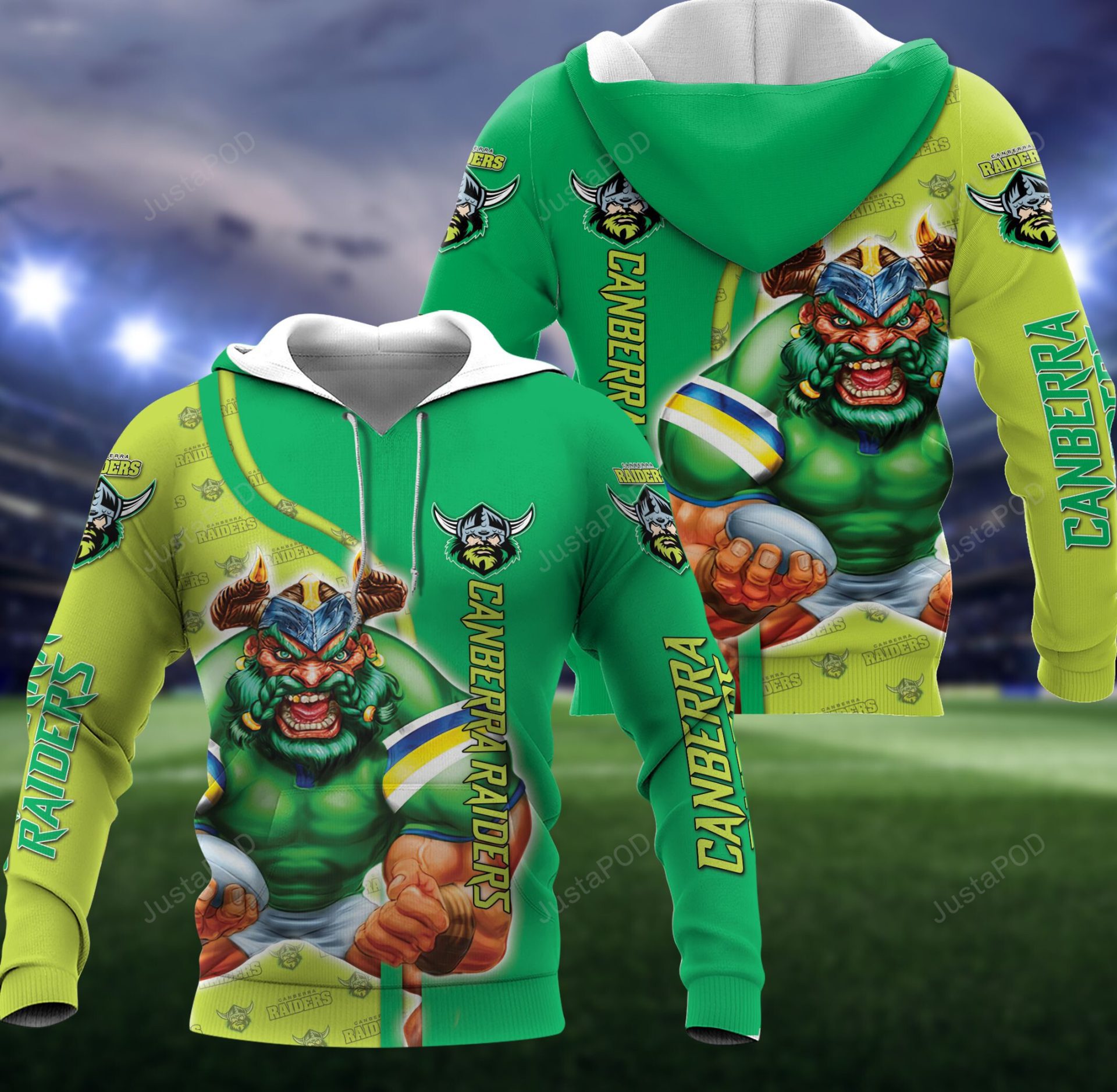 NRL Canberra Raiders Green Special Mascot Pullover Hoodie Product Features Along with its Canberra Raiders graphics, this cozy pullover hoodie features super-soft midweight material. Material: 95% polyester + 5% spandex. The fabric is durable and resistant to wrinkles, shrinking and mildew. Hood with drawstrings. Long sleeve. Front pouch pocket. Midweight hoodie suitable for moderate temperatures....