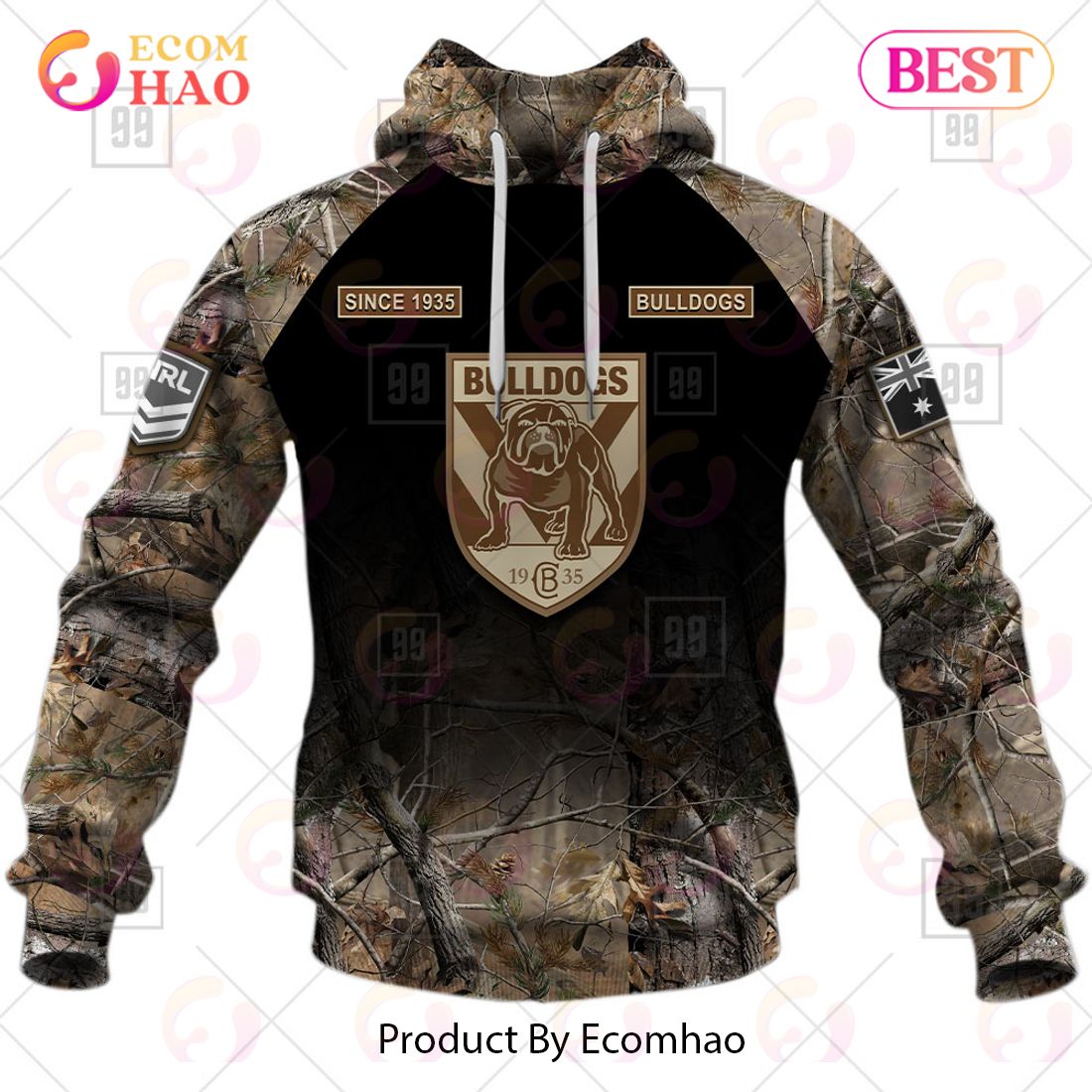 NRL Canterbury-Bankstown Bulldogs Custom Name Number Camo Pullover Hoodie Product Features Along with its Canterbury-Bankstown Bulldogs graphics, this cozy pullover hoodie features super-soft midweight material. Material: 95% polyester + 5% spandex. The fabric is durable and resistant to wrinkles, shrinking and mildew. Hood with drawstrings. Long sleeve. Front pouch pocket. Midweight hoodie suitable for moderate...