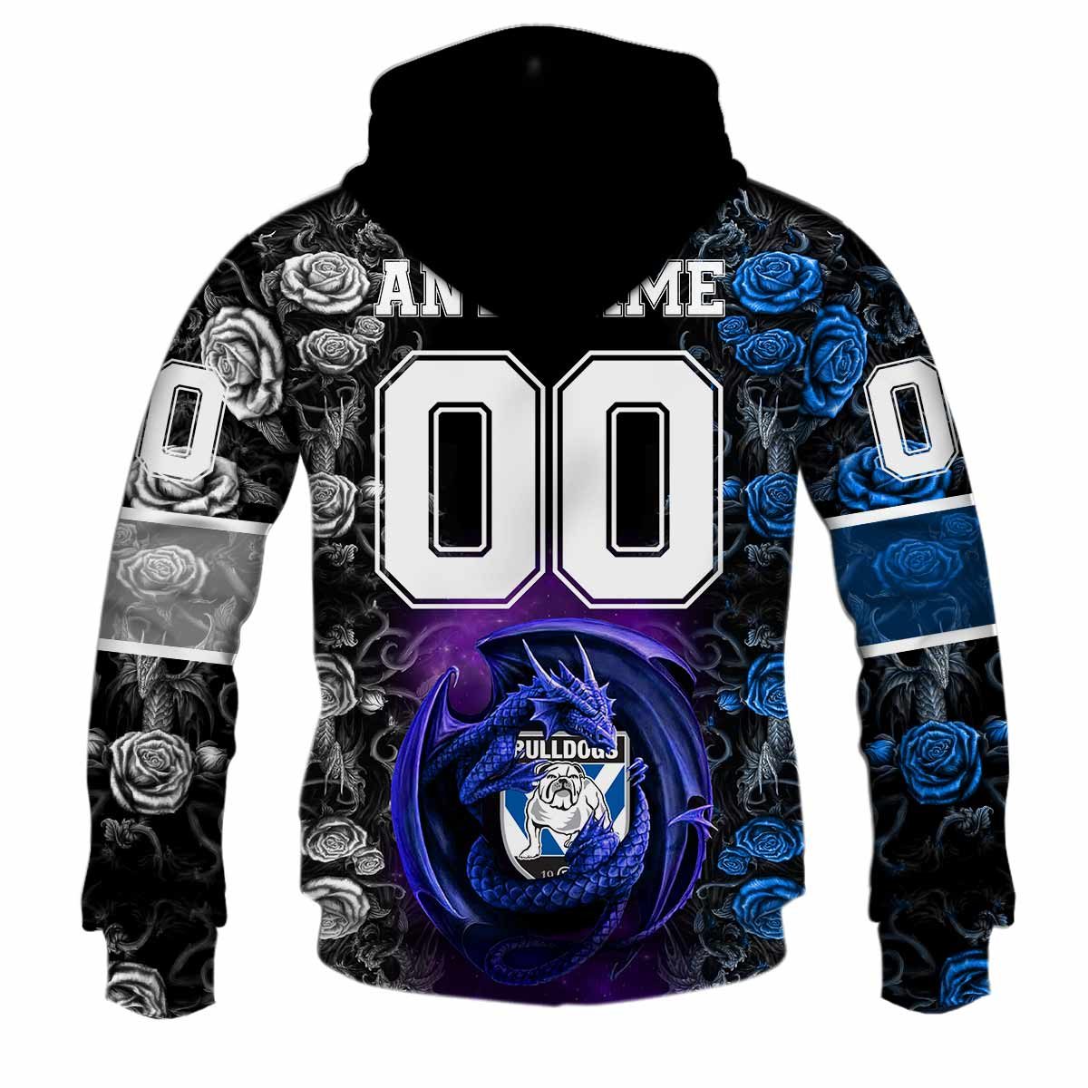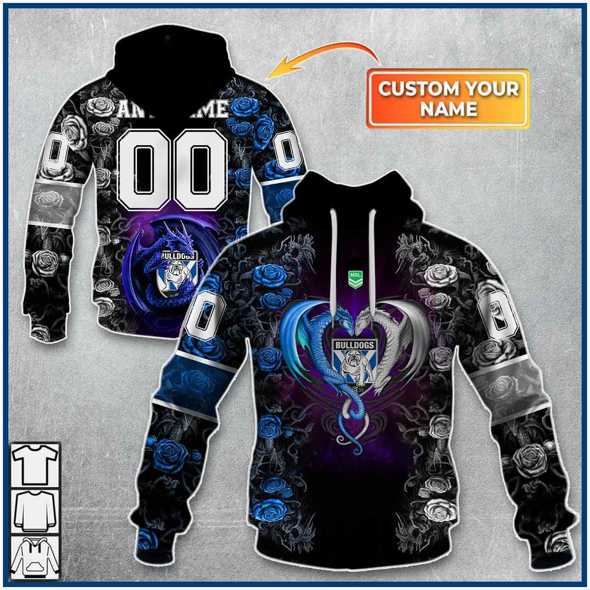 NRL Canterbury-Bankstown Bulldogs Custom Name Number Rose Dragon Pullover Hoodie Product Features Along with its Canterbury-Bankstown Bulldogs graphics, this cozy pullover hoodie features super-soft midweight material. Material: 95% polyester + 5% spandex. The fabric is durable and resistant to wrinkles, shrinking and mildew. Hood with drawstrings. Long sleeve. Front pouch pocket. Midweight hoodie suitable for...