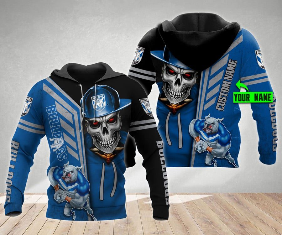 NRL Canterbury-Bankstown Bulldogs Custom Name Skull Mascot Pullover Hoodie Product Features Along with its Canterbury-Bankstown Bulldogs graphics, this cozy pullover hoodie features super-soft midweight material. Material: 95% polyester + 5% spandex. The fabric is durable and resistant to wrinkles, shrinking and mildew. Hood with drawstrings. Long sleeve. Front pouch pocket. Midweight hoodie suitable for moderate...