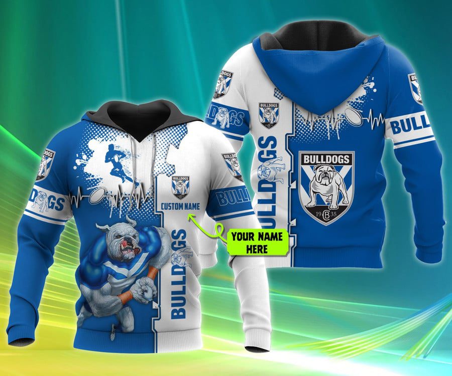 NRL Canterbury-Bankstown Bulldogs Custom Name White Blue Pullover Hoodie V11 Product Features Along with its Canterbury-Bankstown Bulldogs graphics, this cozy pullover hoodie features super-soft midweight material. Material: 95% polyester + 5% spandex. The fabric is durable and resistant to wrinkles, shrinking and mildew. Hood with drawstrings. Long sleeve. Front pouch pocket. Midweight hoodie suitable for...