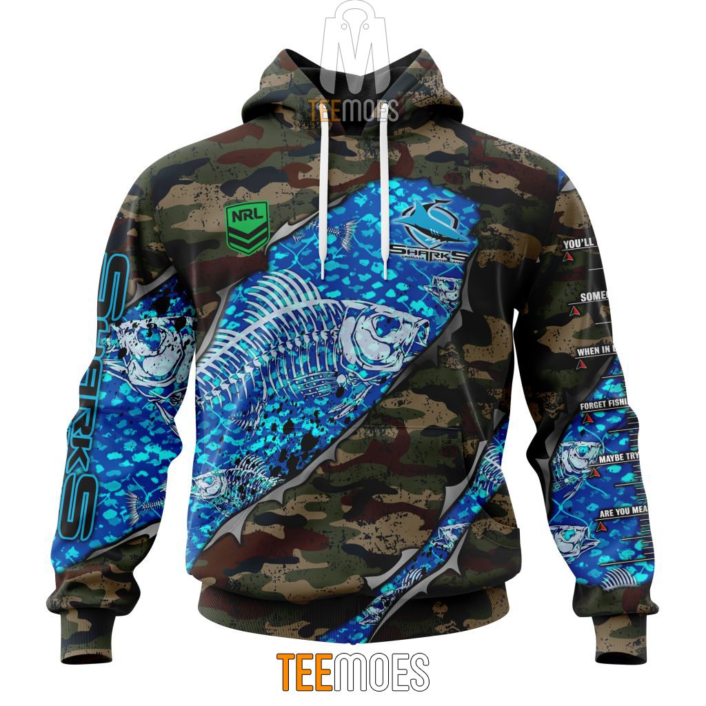 NRL Cronulla-Sutherland Sharks Custom Name Number Special Camo Fishing Pullover Hoodie Product Features Along with its Cronulla-Sutherland Sharks graphics, this cozy pullover hoodie features super-soft midweight material. Material: 95% polyester + 5% spandex. The fabric is durable and resistant to wrinkles, shrinking and mildew. Hood with drawstrings. Long sleeve. Front pouch pocket. Midweight hoodie suitable...
