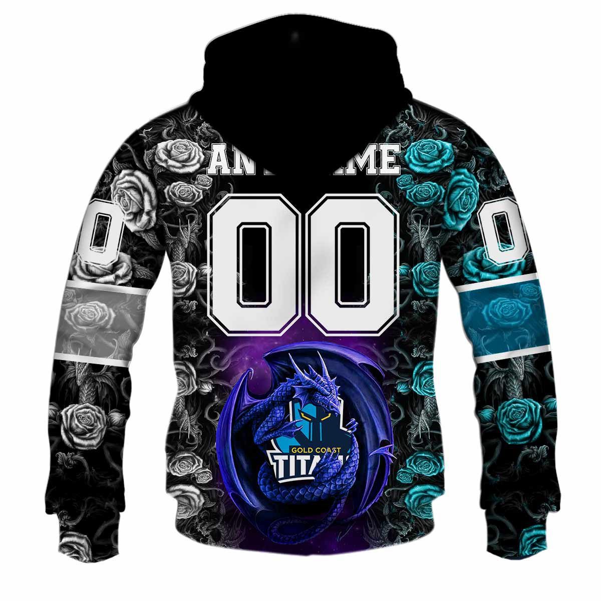 NRL Gold Coast Titans Custom Name Number Rose Dragon Pullover Hoodie
