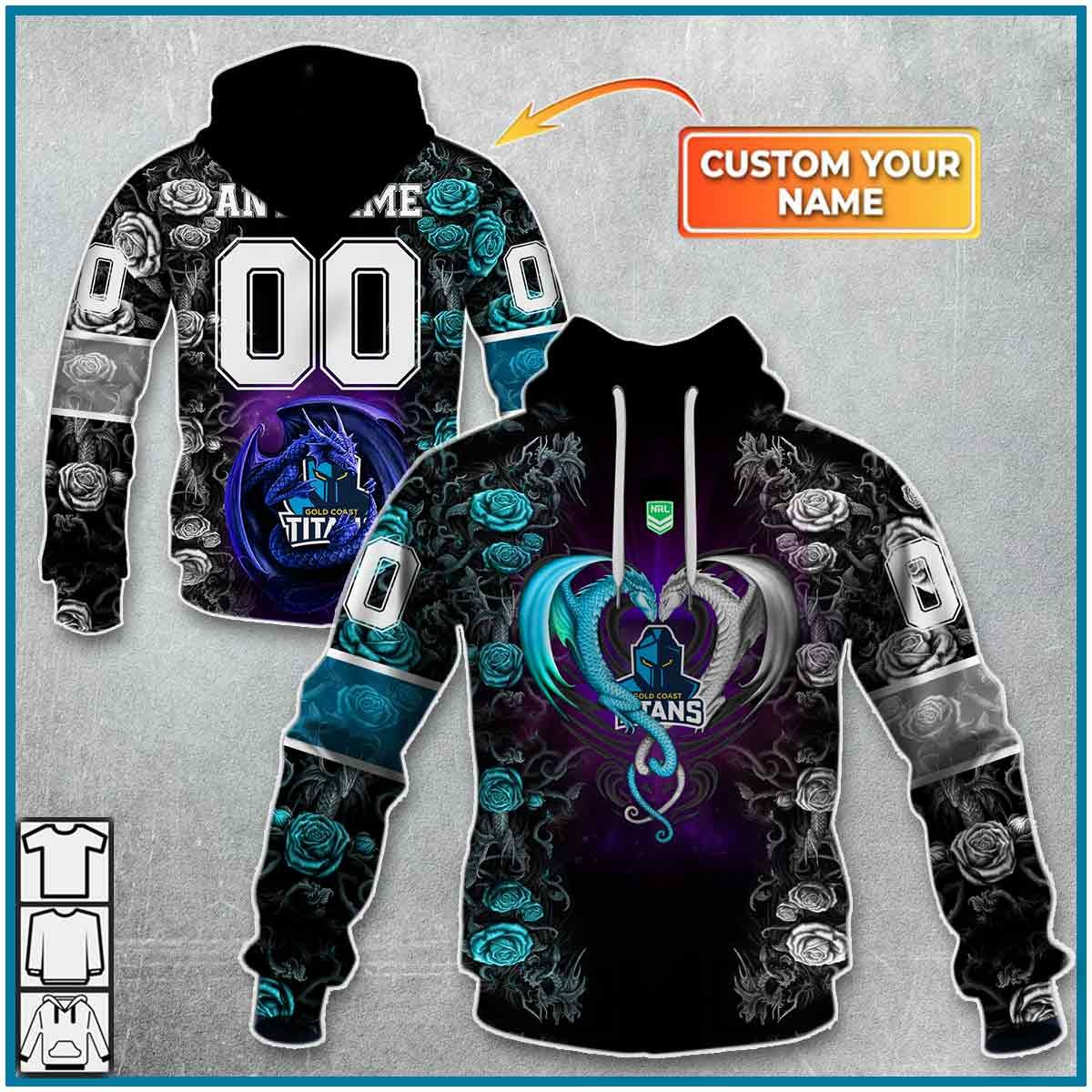 NRL Gold Coast Titans Custom Name Number Rose Dragon Pullover Hoodie Product Features Along with its Gold Coast Titans graphics, this cozy pullover hoodie features super-soft midweight material. Material: 95% polyester + 5% spandex. The fabric is durable and resistant to wrinkles, shrinking and mildew. Hood with drawstrings. Long sleeve. Front pouch pocket. Midweight hoodie...