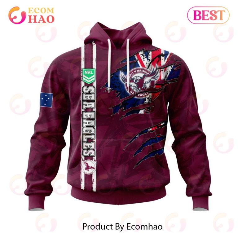 NRL Manly Warringah Sea Eagles Custom Name Number Flag Scratch Pullover Hoodie Product Features Along with its Manly Warringah Sea Eagles graphics, this cozy pullover hoodie features super-soft midweight material. Material: 95% polyester + 5% spandex. The fabric is durable and resistant to wrinkles, shrinking and mildew. Hood with drawstrings. Long sleeve. Front pouch pocket....