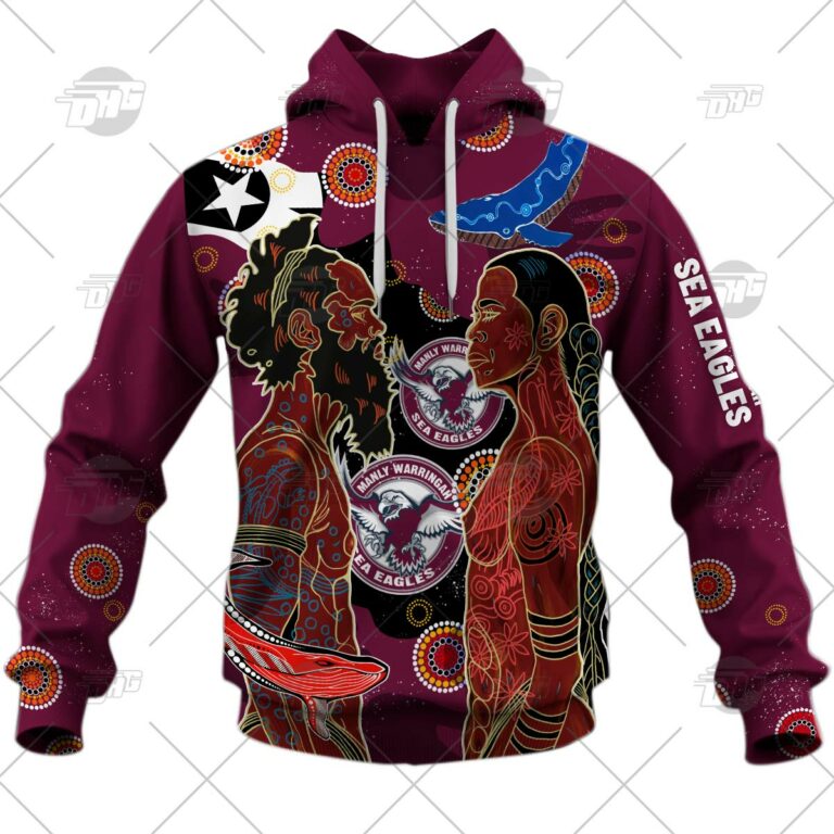 NRL Manly Warringah Sea Eagles Indigenous 2022 NAIDOC Week Pullover Hoodie Product Features Along with its Manly Warringah Sea Eagles graphics, this cozy pullover hoodie features super-soft midweight material. Material: 95% polyester + 5% spandex. The fabric is durable and resistant to wrinkles, shrinking and mildew. Hood with drawstrings. Long sleeve. Front pouch pocket. Midweight...