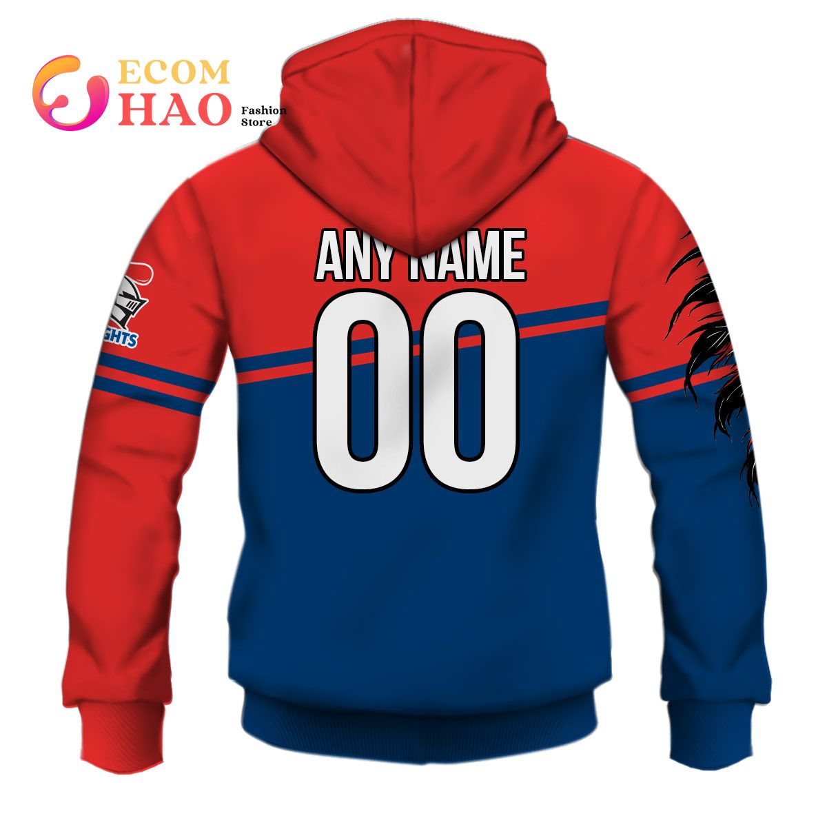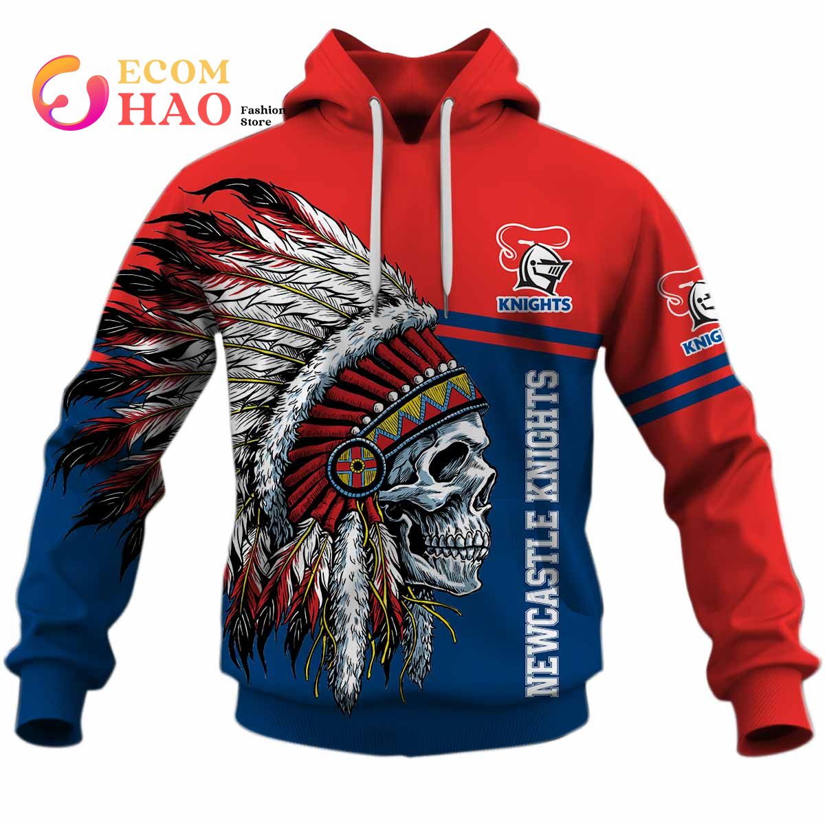 NRL Newcastle Knights Custom Name Number Native Skull Pullover Hoodie Product Features Along with its Newcastle Knights graphics, this cozy pullover hoodie features super-soft midweight material. Material: 95% polyester + 5% spandex. The fabric is durable and resistant to wrinkles, shrinking and mildew. Hood with drawstrings. Long sleeve. Front pouch pocket. Midweight hoodie suitable for...