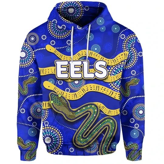 NRL Parramatta Eels Aboriginal Tribal Style Pullover Hoodie Product Features Along with its Parramatta Eels graphics, this cozy pullover hoodie features super-soft midweight material. Material: 95% polyester + 5% spandex. The fabric is durable and resistant to wrinkles, shrinking and mildew. Hood with drawstrings. Long sleeve. Front pouch pocket. Midweight hoodie suitable for moderate temperatures....