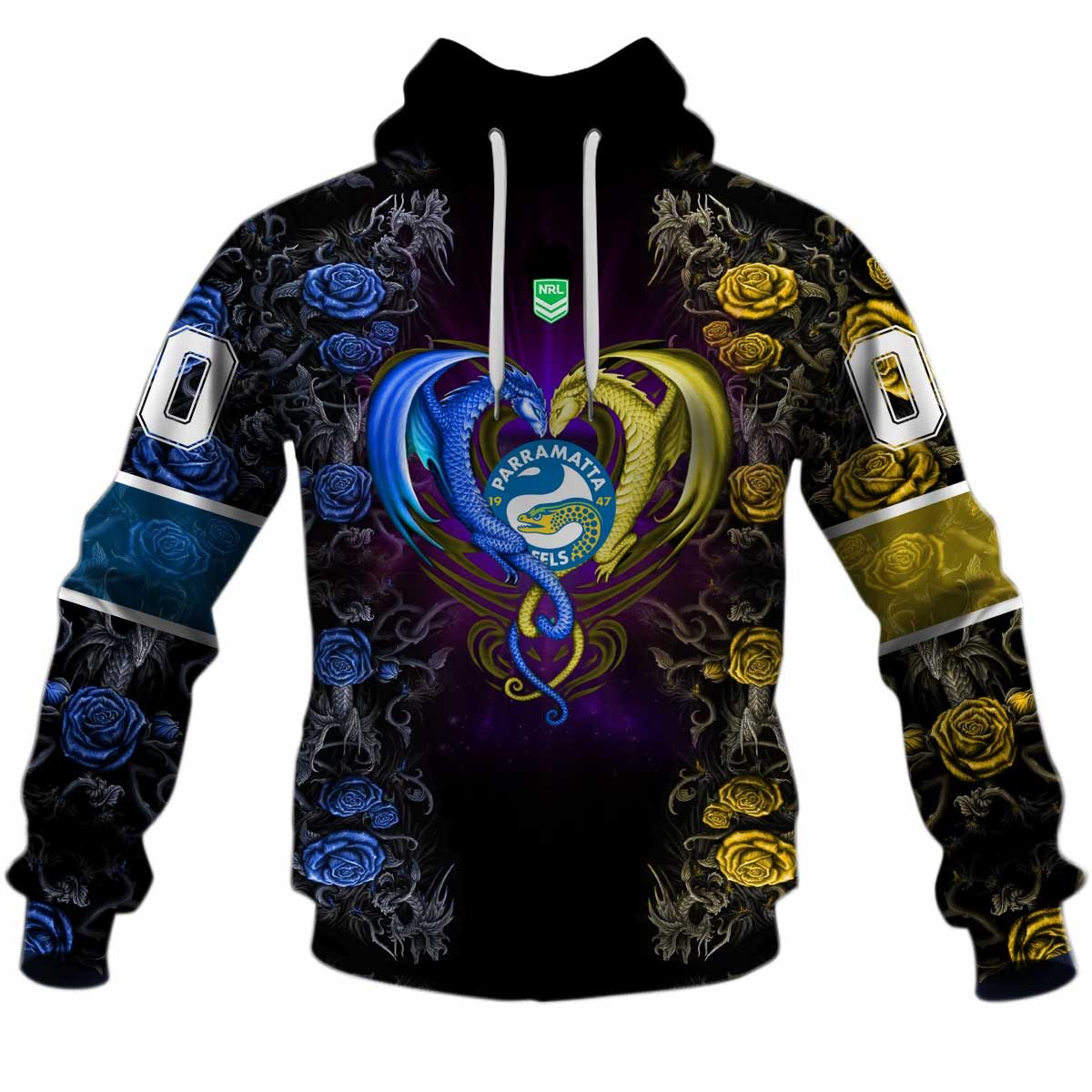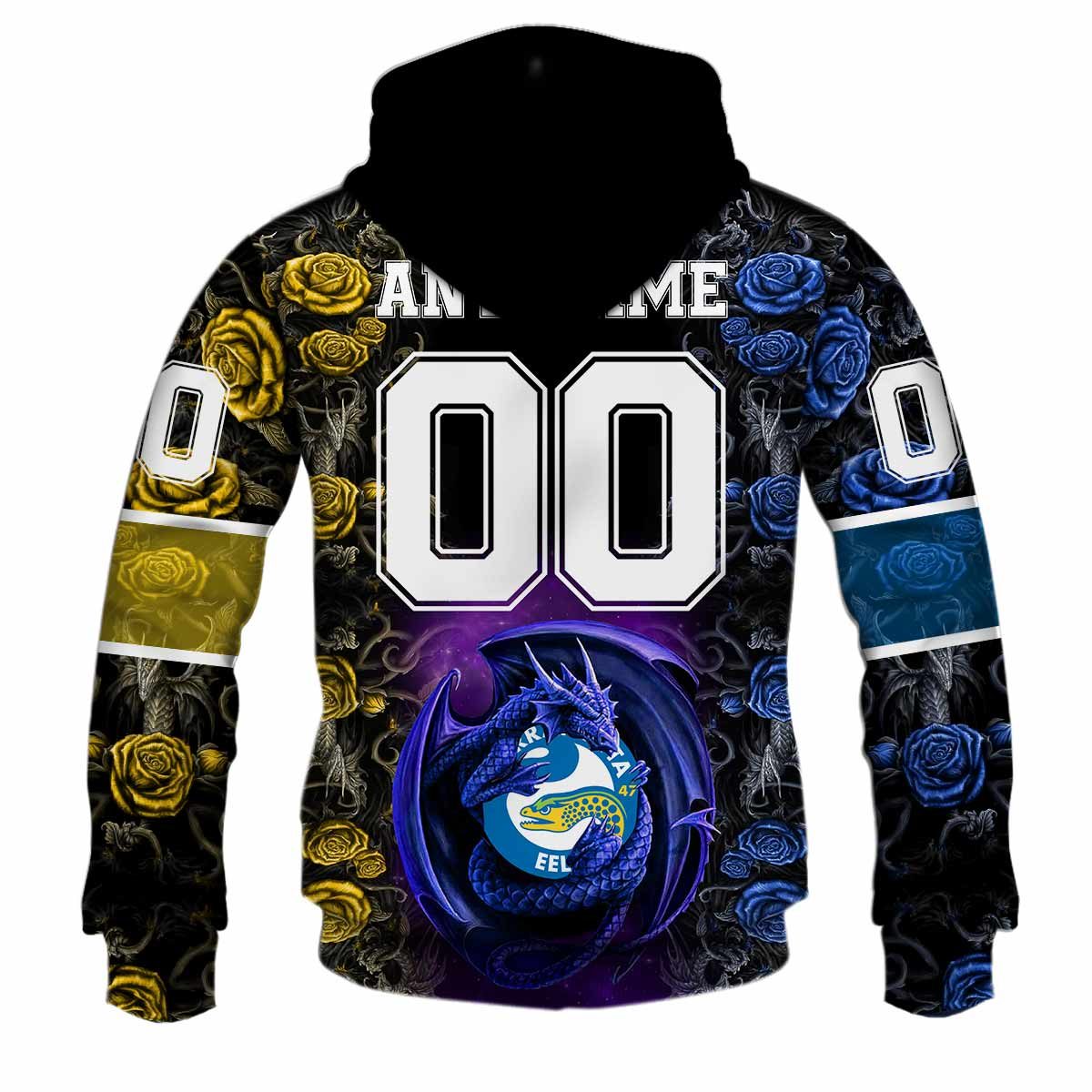 NRL Parramatta Eels Custom Name Number Rose Dragon Pullover Hoodie