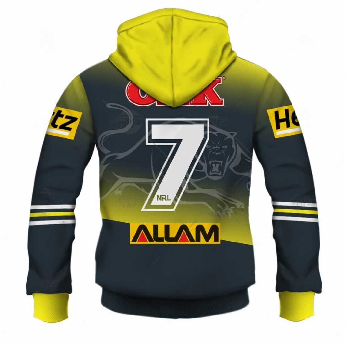 NRL Penrith Panthers Nathan Cleary #7 Pullover Hoodie Product Features Along with its Penrith Panthers graphics, this cozy pullover hoodie features super-soft midweight material. Material: 95% polyester + 5% spandex. The fabric is durable and resistant to wrinkles, shrinking and mildew. Hood with drawstrings. Long sleeve. Front pouch pocket. Midweight hoodie suitable for moderate temperatures....