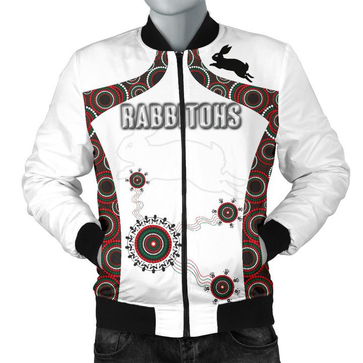 NRL South Sydney Rabbitohs Indigenous White Bomber Jacket Product Features This sweet bomber jacket features crisp South Sydney Rabbitohs graphics that put your fandom proudly on display, so no one will be able to question your allegiance. Always on-trend: Matches seamlessly with anything underneath ? definitely a wardrobe staple. Comfy & warm: With ample lining...