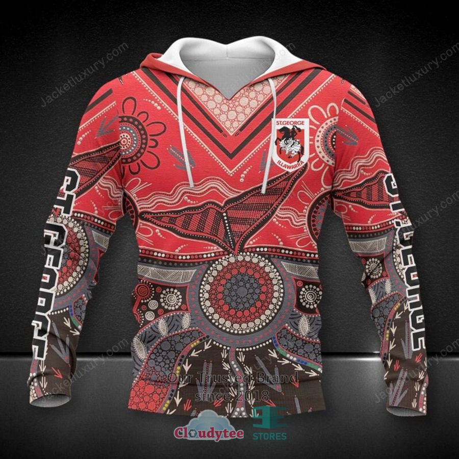NRL St. George Illawarra Dragons Aboriginal Pattern Pullover Hoodie Product Features Along with its St. George Illawarra Dragons graphics, this cozy pullover hoodie features super-soft midweight material. Material: 95% polyester + 5% spandex. The fabric is durable and resistant to wrinkles, shrinking and mildew. Hood with drawstrings. Long sleeve. Front pouch pocket. Midweight hoodie suitable...