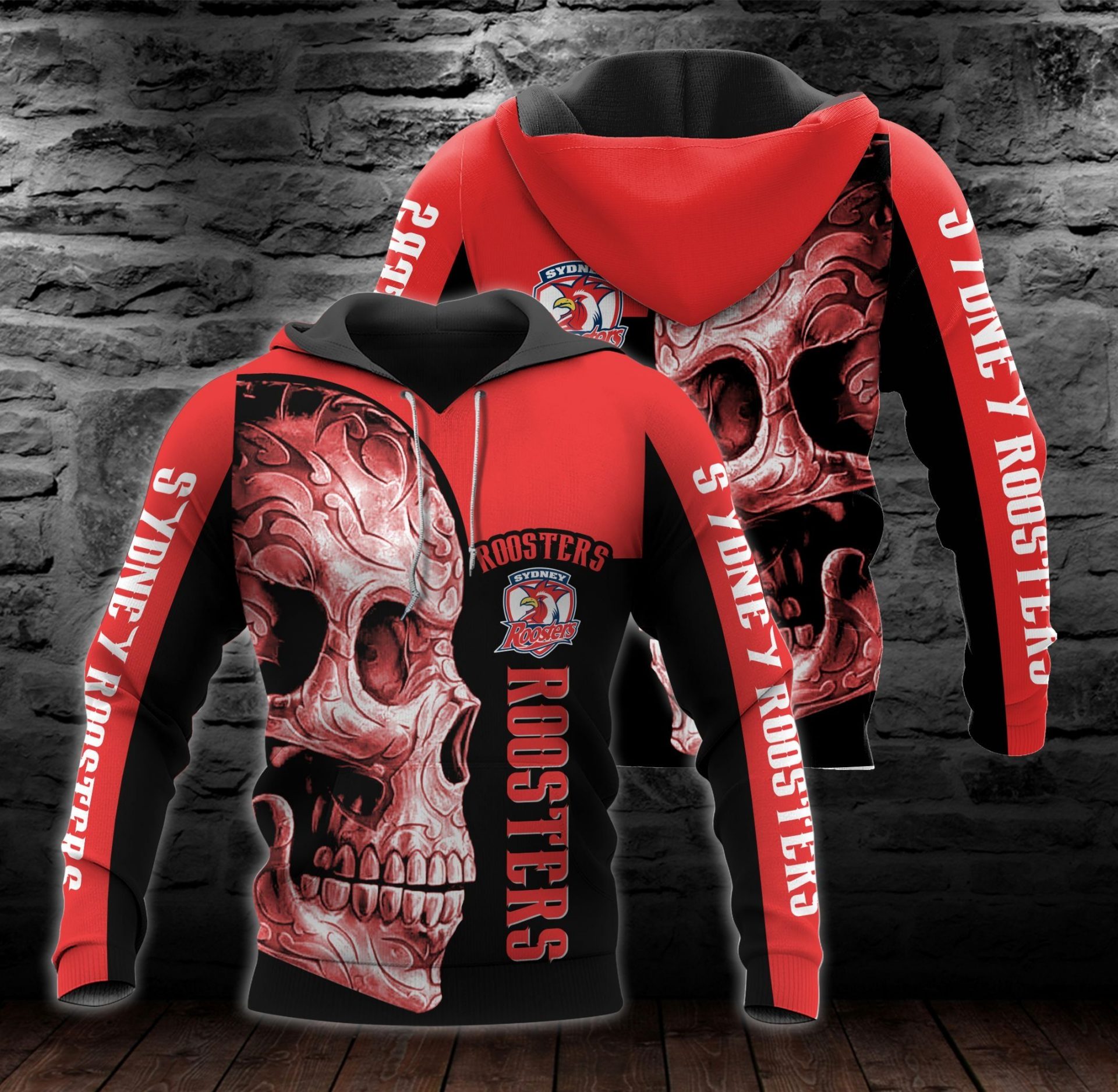 NRL Sydney Roosters Custom Name Skull Pullover Hoodie Product Features Along with its Sydney Roosters graphics, this cozy pullover hoodie features super-soft midweight material. Material: 95% polyester + 5% spandex. The fabric is durable and resistant to wrinkles, shrinking and mildew. Hood with drawstrings. Long sleeve. Front pouch pocket. Midweight hoodie suitable for moderate temperatures....