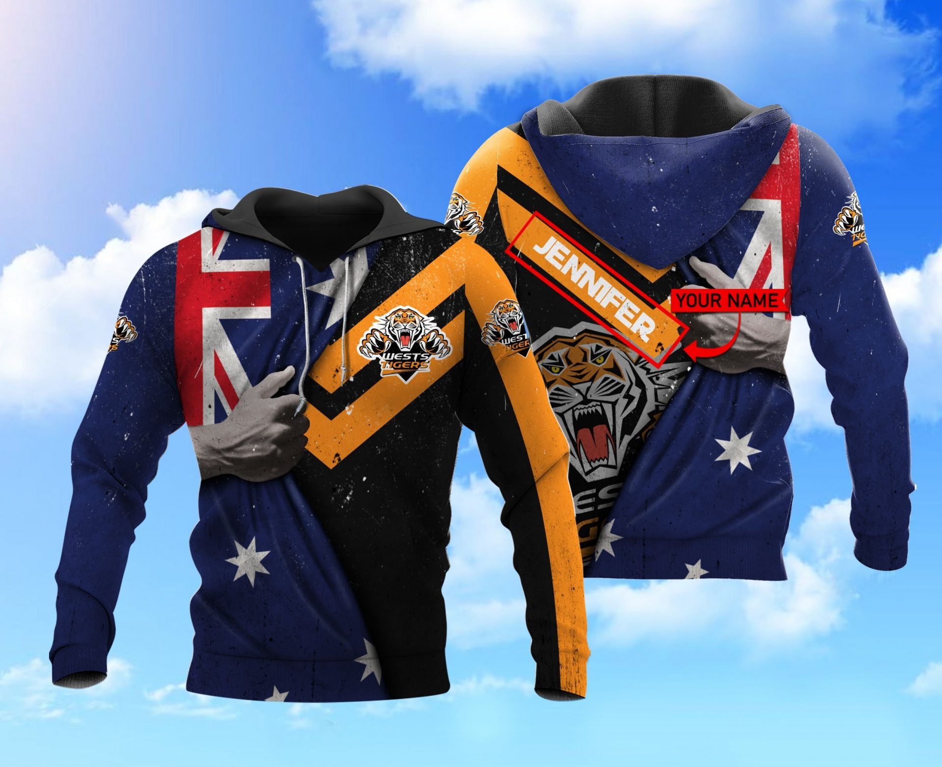 NRL Wests Tigers Custom Name Australian Flag Pullover Hoodie Product Features Along with its Wests Tigers graphics, this cozy pullover hoodie features super-soft midweight material. Material: 95% polyester + 5% spandex. The fabric is durable and resistant to wrinkles, shrinking and mildew. Hood with drawstrings. Long sleeve. Front pouch pocket. Midweight hoodie suitable for moderate...