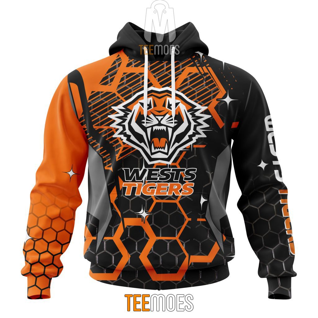 NRL Wests Tigers Custom Name Number MotoCross Style Pullover Hoodie Product Features Along with its Wests Tigers graphics, this cozy pullover hoodie features super-soft midweight material. Material: 95% polyester + 5% spandex. The fabric is durable and resistant to wrinkles, shrinking and mildew. Hood with drawstrings. Long sleeve. Front pouch pocket. Midweight hoodie suitable for...