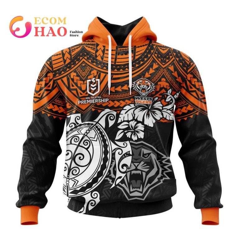 NRL Wests Tigers Custom Name Number Polynesian Pullover Hoodie Product Features Along with its Wests Tigers graphics, this cozy pullover hoodie features super-soft midweight material. Material: 95% polyester + 5% spandex. The fabric is durable and resistant to wrinkles, shrinking and mildew. Hood with drawstrings. Long sleeve. Front pouch pocket. Midweight hoodie suitable for moderate...