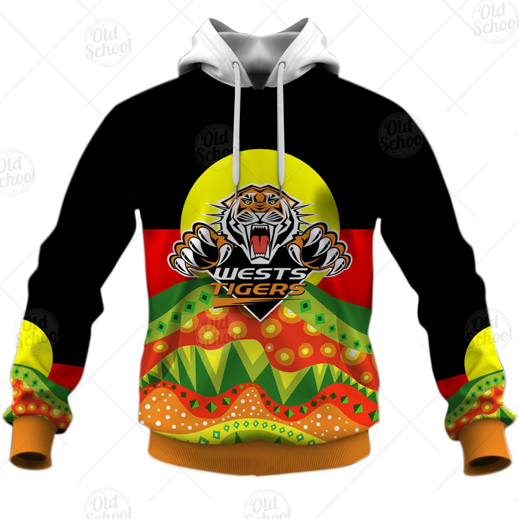 NRL Wests Tigers Dinky Di Lover Aboriginal Flag x Indigenous Pullover Hoodie Product Features Along with its Wests Tigers graphics, this cozy pullover hoodie features super-soft midweight material. Material: 95% polyester + 5% spandex. The fabric is durable and resistant to wrinkles, shrinking and mildew. Hood with drawstrings. Long sleeve. Front pouch pocket. Midweight hoodie...