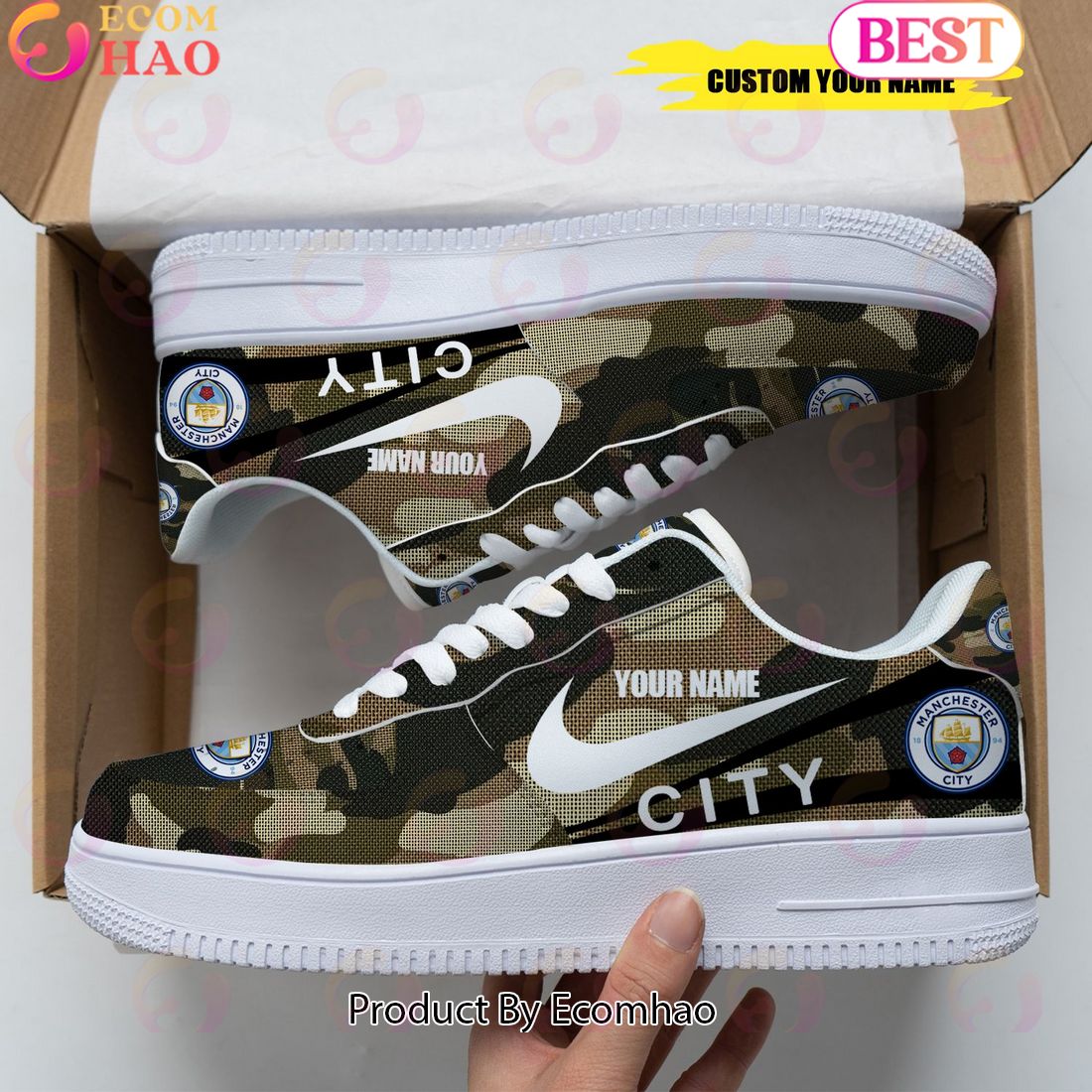 Personalized Name Manchester City FC Camouflage Air Force 1 Sneaker This pair of Personalized Name Manchester City FC Camouflage Air Force 1 Sneakers is ideal for anyone looking for a unique design and style. They feature an eye-catching camouflage print and the Manchester City FC crest on the tongue. The low-cut collar gives you a...