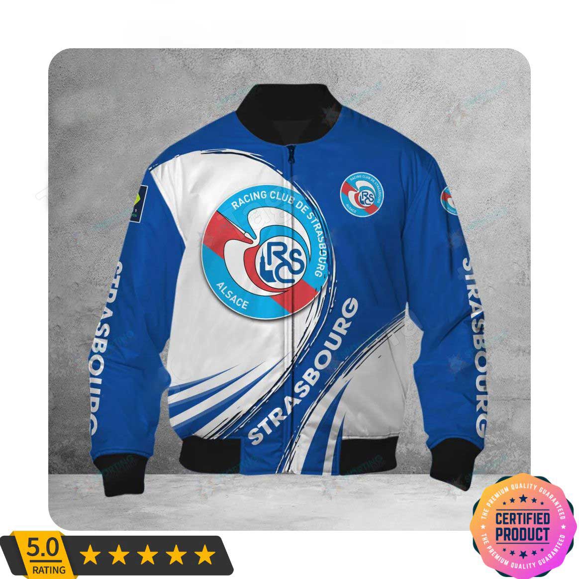 RC Strasbourg Alsace Blue White Logo Bomber Jacket Product Features This sweet bomber jacket features crisp RC Strasbourg Alsace graphics that put your fandom proudly on display, so no one will be able to question your allegiance. Always on-trend: Matches seamlessly with anything underneath ? definitely a wardrobe staple. Comfy & warm: With ample lining...