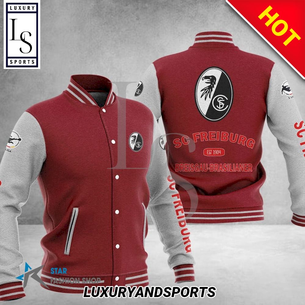 This SC Freiburg Baseball Jacket is crafted from durable materials and features a full-snap closure.