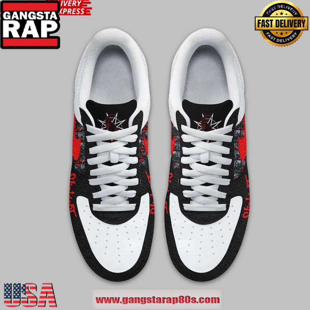The Air Force 1 silhouette provides a classic foundation, complemented by modern design elements such as intricate stitching patterns and the distinctive Slipknot logo on the heel, reflecting your commitment to both high fashion and high fidelity.