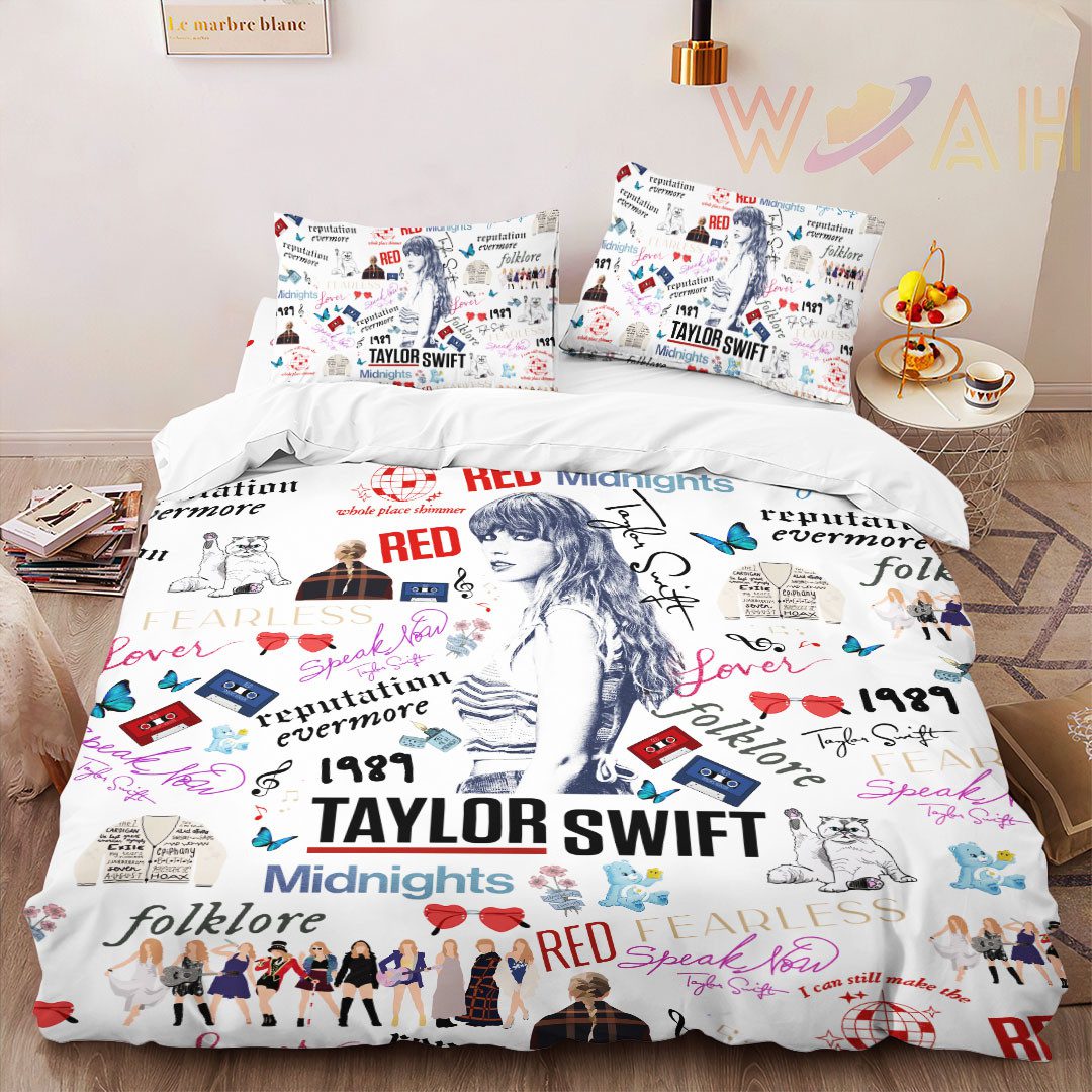 Product Features This Taylor Swift quilt cover set is custom-made-to-order and handcrafted to the highest quality standards. Material: 100% Polyester. Comes with one doona cover and two pillowcases. Pillow inserts and duvet inserts are not included. SOFT & COMFORTABLE – Made using soft material with siliconized fiber filling that provides a comfy and cozy feel...