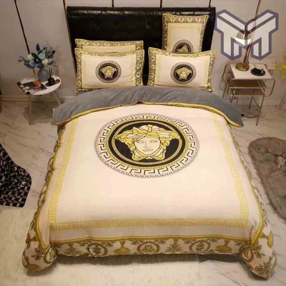 What sets this bedding set apart is its iconic Versace design. The exquisite beige color serves as a backdrop for the legendary Versace logo and intricate motifs that adorn the fabric. These meticulously crafted patterns showcase the brand’s signature style, instantly adding a touch of glamour and prestige to your bedroom.
