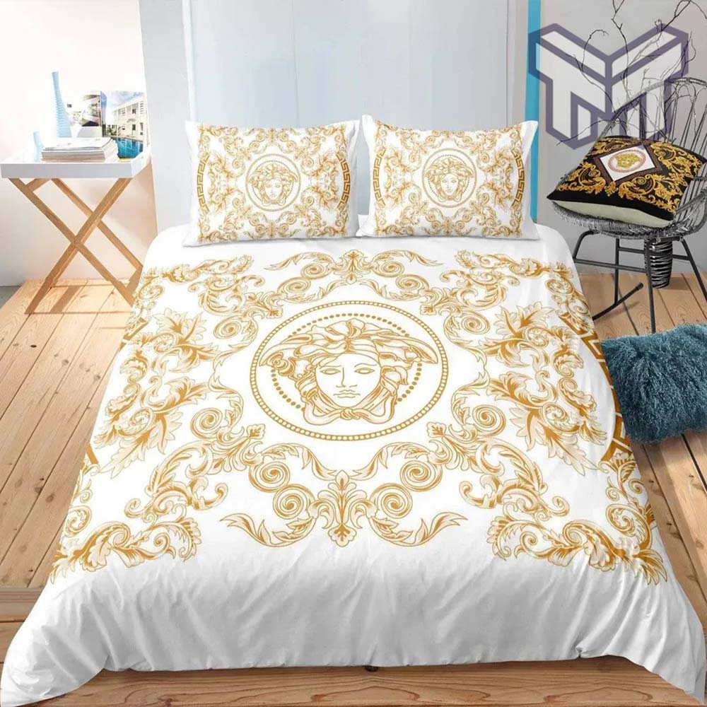 Versace Medusa Golden Pattern White Luxury Brand Bedding Set Duvet Cover Home Decor, The Best Quantity and Service: