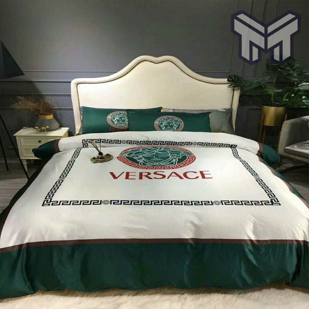 Versace White Green Fashion Logo Luxury Brand Bedding Set Home Decor, The Best Quantity and Service:
