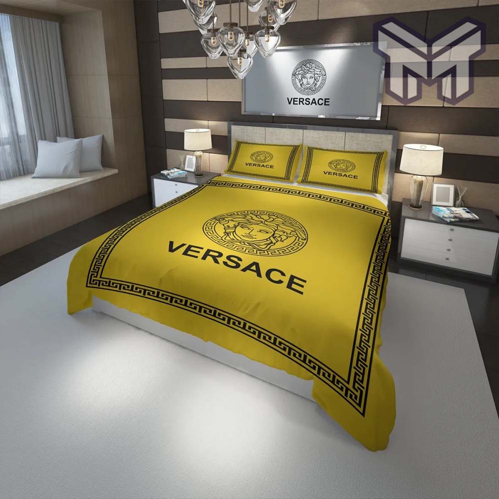 The hot Versace yellow fashion luxury brand bedding set is a beautiful addition to any bedroom decor. Made with high-quality materials, the set includes a bedspread, duvet cover, and pillowcases that are soft and comfortable to sleep in. The bright yellow color of the bedding set is eye-catching and sure to make a statement in any room. The intricate design features the iconic Versace Medusa head logo, adding a touch of elegance and sophistication. The set is perfect for those who want to add a touch of luxury to their home decor and enjoy a comfortable night’s sleep. It’s a great gift idea for fashion enthusiasts or anyone who loves high-end designer brands.