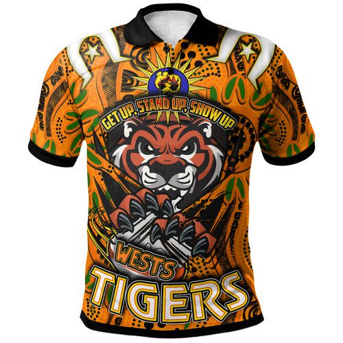 Wests Tigers Polo Shirt – Custom Naidoc Week Wests Tigers Ball Aboriginal Inspired Culture “Get Up, Stand Up, Show Up” Polo Shirt