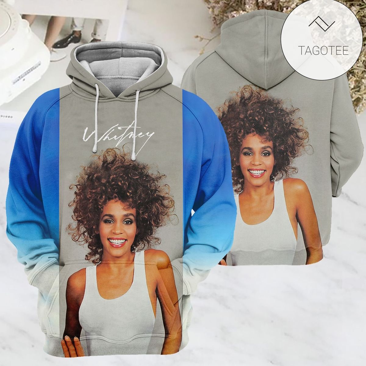 Whitney Houston Blue Grey Pullover Hoodie Product Features Along with its Whitney Houston graphics, this cozy pullover hoodie features super-soft midweight material. Material: 95% polyester + 5% spandex. The fabric is durable and resistant to wrinkles, shrinking and mildew. Hood with drawstrings. Long sleeve. Front pouch pocket. Midweight hoodie suitable for moderate temperatures. Features a...