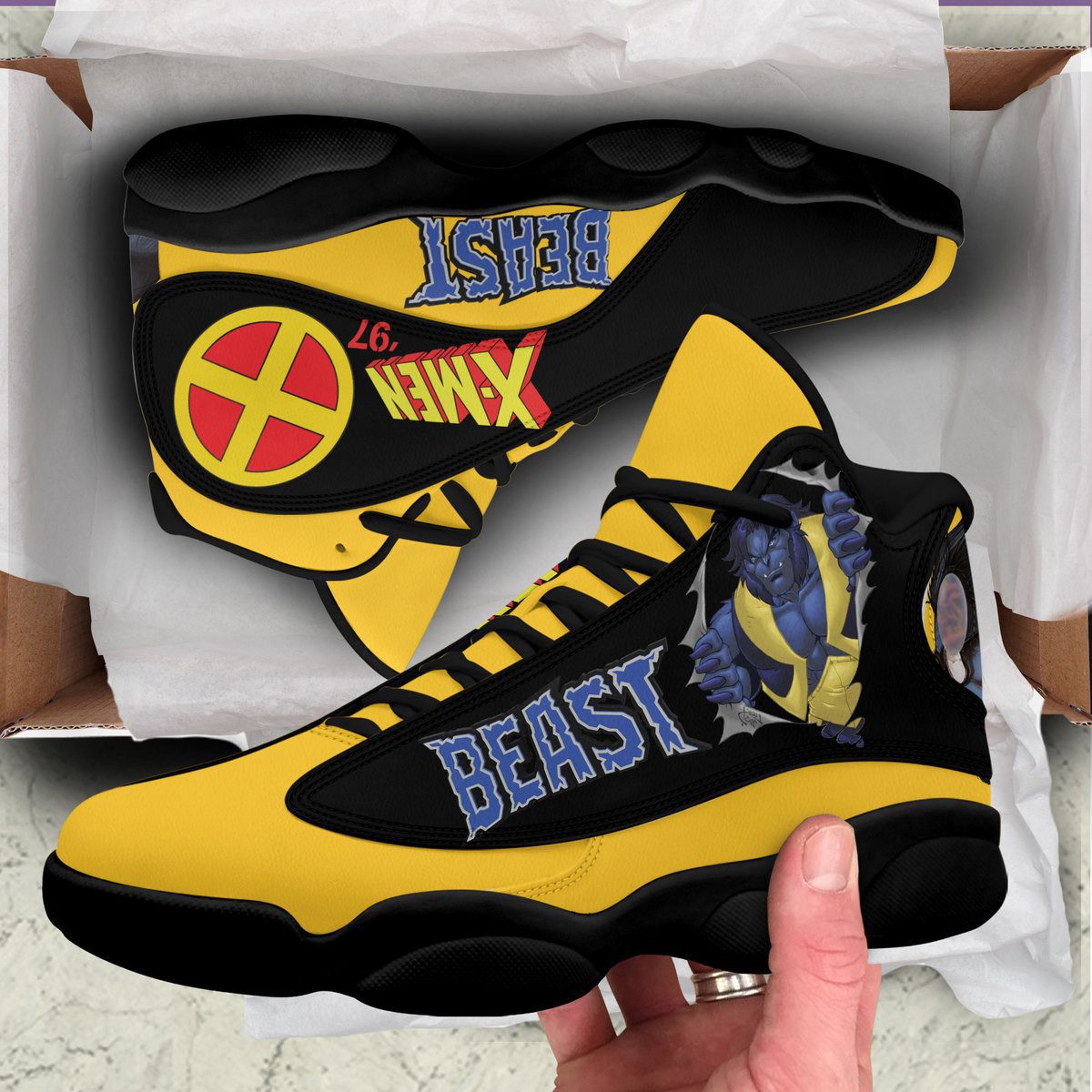 A Fusion of Style and Performance: Crafted with premium materials, the X-Men AJ13 Sneakers offer both comfort and durability. The sleek and aerodynamic design, inspired by the X-Men’s agility and power, ensures a stylish and athletic look.